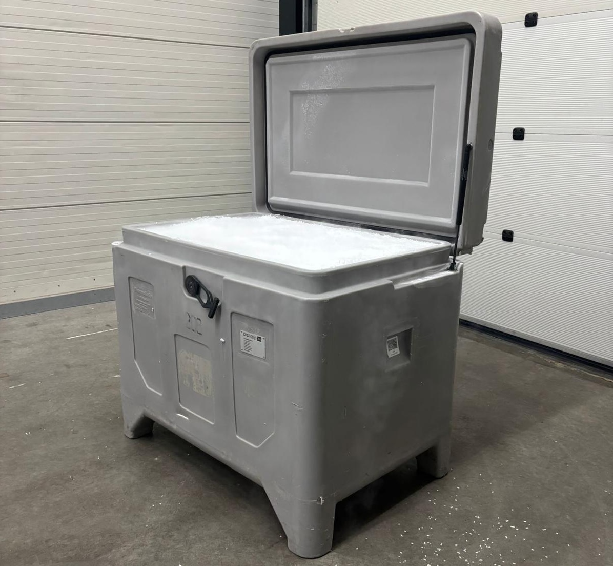 Droogijspellets in speciale palletboxen of containers. Van 9 en tot 250 kg